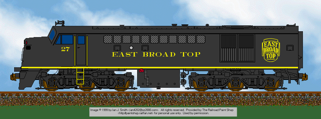 Artist's Note: I model the East Broad Top as if it had continued as a common carrier into the 1980's. When the oil embargoes of the late 60's early 70's occurred, America was searching for a cheap but proven source of alternative fuel. Given its long track record, coal was chosen. The East Broad Top modernized, much like the White Pass and Yukon, using export locomotives of 3 foot gauge. The original steamers are kept for sentimental reasons, and for use during tourist season in the summer. They are also pressed into occasional revenue service during peak demand seasons.