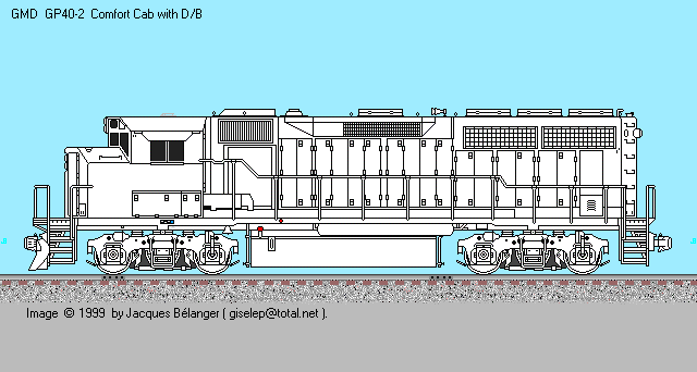 GP40-2W drawing © 1999 by Jacques Belanger. All rights reserved. Used by permission. If you would like to use this image, or a painted version of it on your web site, you may do so, providing that you notify the artist and place a link back to The Railroad Paintshop. Linking directly to the image on the Railroad Paint Shop site is prohibited. If you want to use the image in any other form of publication, you must have the prior written permission of the artist.