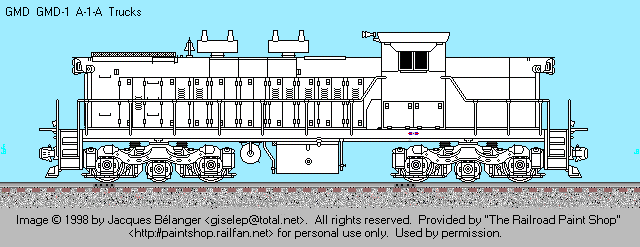 GMD GMD1 (A-1-A Trucks) drawing © 1998 by Jacques Belanger. All rights reserved. Used by permission. If you would like to use this image, or a painted version of it on your web site, you may do so, providing that you notify the artist and place a link back to The Railroad Paintshop. Linking directly to the image on the Railroad Paint Shop site is prohibited. If you want to use the image in any other form of publication, you must have the prior written permission of the artist.
