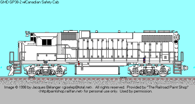 GMD GP38-2 drawing © 1998 by Jacques Belanger. All rights reserved. Used by permission. If you would like to use this image, or a painted version of it on your web site, you may do so, providing that you notify the artist and place a link back to The Railroad Paintshop. Linking directly to the image on the Railroad Paint Shop site is prohibited. If you want to use the image in any other form of publication, you must have the prior written permission of the artist.