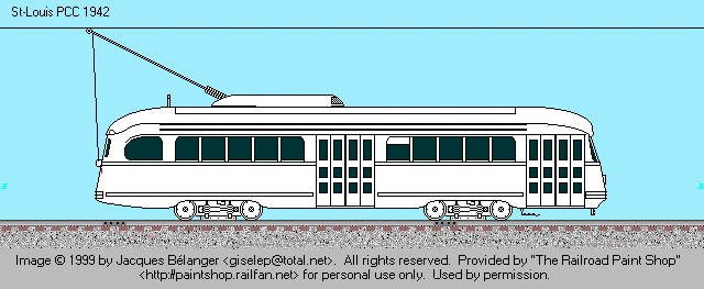 PCC streetcar (1942 version) drawing © 1999 by Jacques Belanger. All rights reserved. Used by permission. If you would like to use this image, or a painted version of it on your web site, you may do so, providing that you notify the artist and place a link back to The Railroad Paintshop. Linking directly to the image on the Railroad Paint Shop site is prohibited. If you want to use the image in any other form of publication, you must have the prior written permission of the artist.