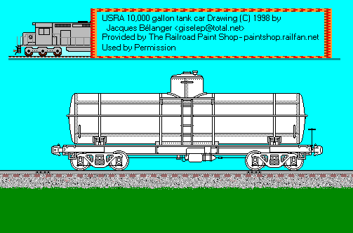 USRA tank car drawing © 1998 by Jacques Belanger. All rights reserved. Used by permission. If you would like to use this image, or a painted version of it on your web site, you may do so, providing that you notify the artist and place a link back to The Railroad Paintshop. Linking directly to the image on the Railroad Paint Shop site is prohibited. If you want to use the image in any other form of publication, you must have the prior written permission of the artist.