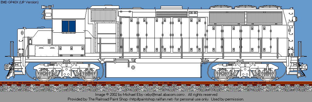 GP40X drawing © 2002 by Michael Eby. All rights reserved. Used by permission. If you would like to use this image, or a painted version of it on your web site, you may do so, providing that you notify the artist and place a link back to The Railroad Paintshop. Linking directly to the image on the Railroad Paint Shop site is prohibited. If you want to use the image in any other form of publication, you must have the prior written permission of the artist.