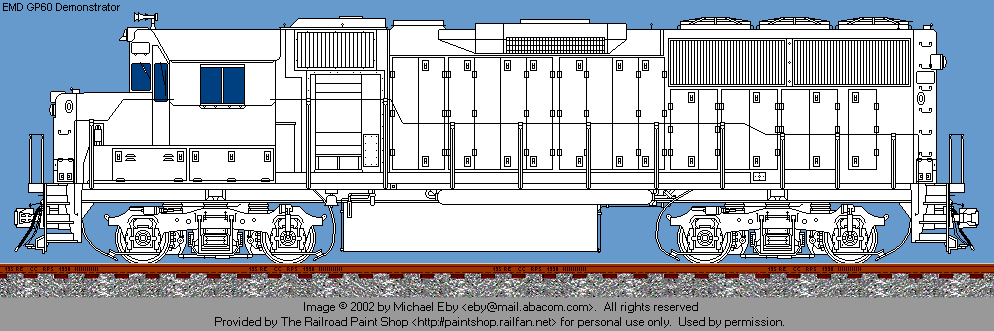 GP60 drawing © 2002 by Michael Eby. All rights reserved. Used by permission. If you would like to use this image, or a painted version of it on your web site, you may do so, providing that you notify the artist and place a link back to The Railroad Paintshop. Linking directly to the image on the Railroad Paint Shop site is prohibited. If you want to use the image in any other form of publication, you must have the prior written permission of the artist.