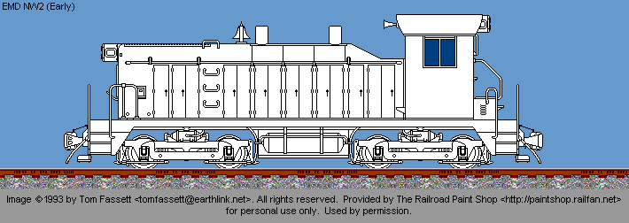NW-2 drawing © 1993 by Tom Fassett. All rights reserved. Used by permission. If you would like to use this image, or a painted version of it on your web site, you may do so, providing that you notify the artist and place a link back to The Railroad Paintshop. Linking directly to the image on the Railroad Paint Shop site is prohibited. If you want to use the image in any other form of publication, you must have the prior written permission of the artist.