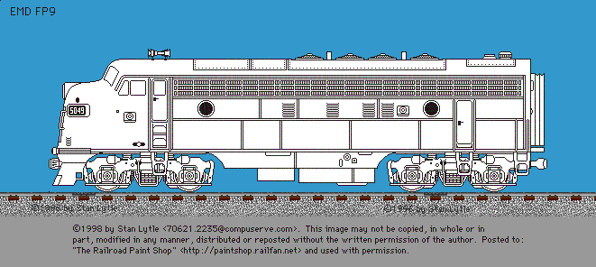 FP9 drawing © 1998 by Stan Lytle. All rights reserved. Used by permission. This image is made available for personal use only. The file may not be modified, combined, compiled, cropped, cut, copied, pasted, reposted, or re-distributed without the prior written permission of the artist. Downloading and saving this file signifies your acceptence of these restrictions. If you would like to use this image, or a painted version of it on your web site, or in any other form of publication, you must request permission from the artist. Linking directly to the image on the Railroad Paint Shop site is prohibited.
