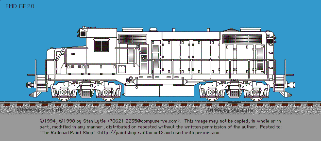 GP20 drawing © 1994 by Stan Lytle. All rights reserved. Used by permission. This image is made available for personal use only. The file may not be modified, combined, compiled, cropped, cut, copied, pasted, reposted, or re-distributed without the prior written permission of the artist. Downloading and saving this file signifies your acceptence of these restrictions. If you would like to use this image, or a painted version of it on your web site, or in any other form of publication, you must request permission from the artist. Linking directly to the image on the Railroad Paint Shop site is prohibited.