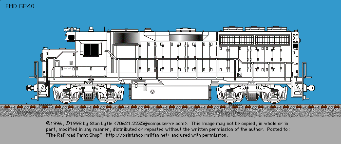 GP40 drawing © 1996 by Stan Lytle. All rights reserved. Used by permission. This image is made available for personal use only. The file may not be modified, combined, compiled, cropped, cut, copied, pasted, reposted, or re-distributed without the prior written permission of the artist. Downloading and saving this file signifies your acceptence of these restrictions. If you would like to use this image, or a painted version of it on your web site, or in any other form of publication, you must request permission from the artist. Linking directly to the image on the Railroad Paint Shop site is prohibited.