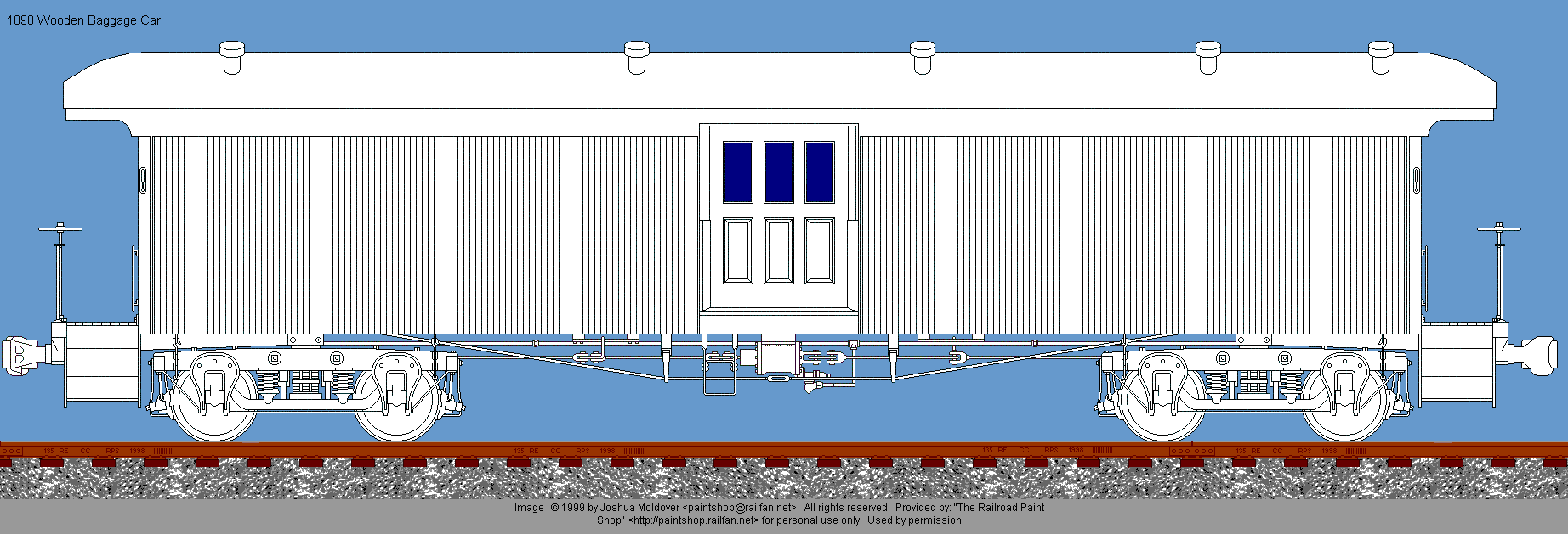 1890 wooden baggage car drawing © 1999 by Joshua Moldover. All rights reserved. Used by permission. If you would like to use this image, or a painted version of it on your web site, you may do so, providing that you notify the artist and place a link back to The Railroad Paintshop. Linking directly to the image on the Railroad Paint Shop site is prohibited. If you want to use the image in any other form of publication, you must have the prior written permission of the artist.