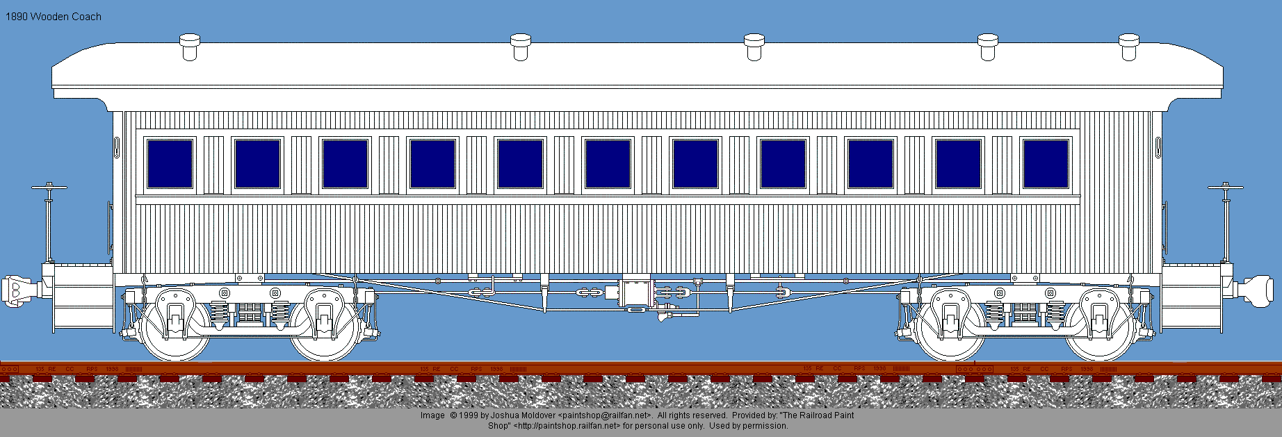 1890 wooden coach drawing © 1999 by Joshua Moldover. All rights reserved. Used by permission. If you would like to use this image, or a painted version of it on your web site, you may do so, providing that you notify the artist and place a link back to The Railroad Paintshop. Linking directly to the image on the Railroad Paint Shop site is prohibited. If you want to use the image in any other form of publication, you must have the prior written permission of the artist.