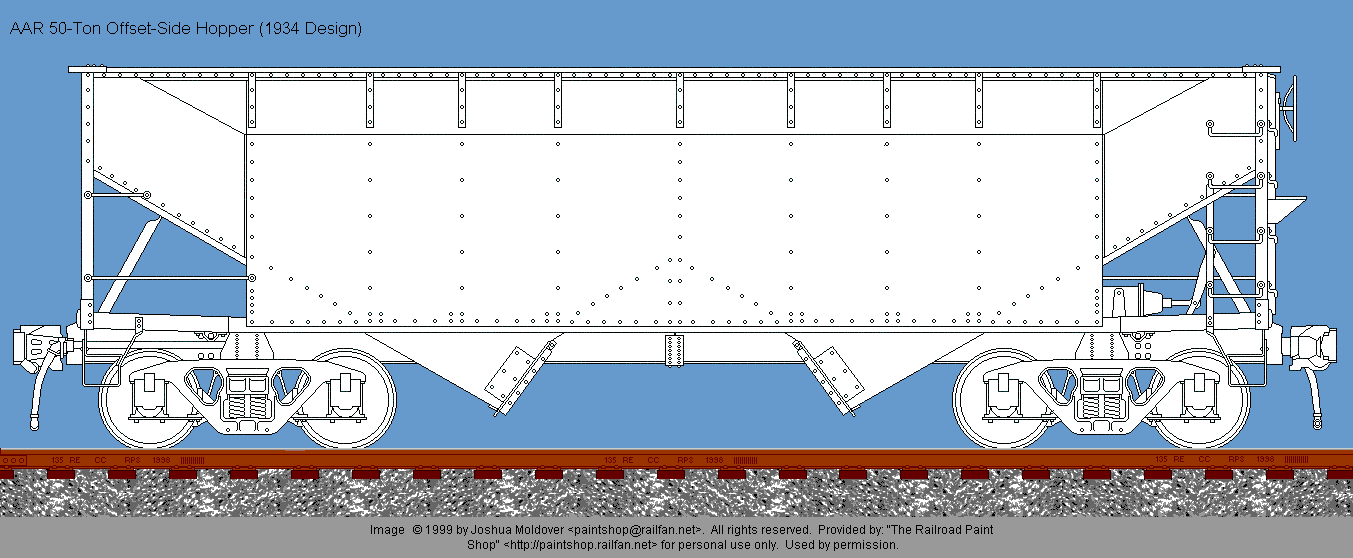 AAR 50-ton offset-side hopper drawing © 1999 by Joshua Moldover. All rights reserved. Used by permission. If you would like to use this image, or a painted version of it on your web site, you may do so, providing that you notify the artist and place a link back to The Railroad Paintshop. Linking directly to the image on the Railroad Paint Shop site is prohibited. If you want to use the image in any other form of publication, you must have the prior written permission of the artist.