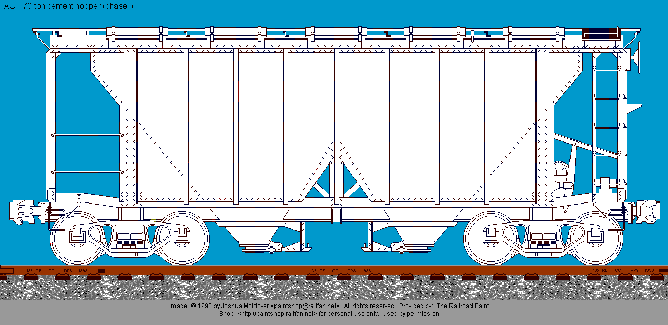 ACF 70-ton cement hopper drawing © 1998 by Joshua Moldover. All rights reserved. Used by permission. If you would like to use this image, or a painted version of it on your web site, you may do so, providing that you notify the artist and place a link back to The Railroad Paintshop. Linking directly to the image on the Railroad Paint Shop site is prohibited. If you want to use the image in any other form of publication, you must have the prior written permission of the artist.