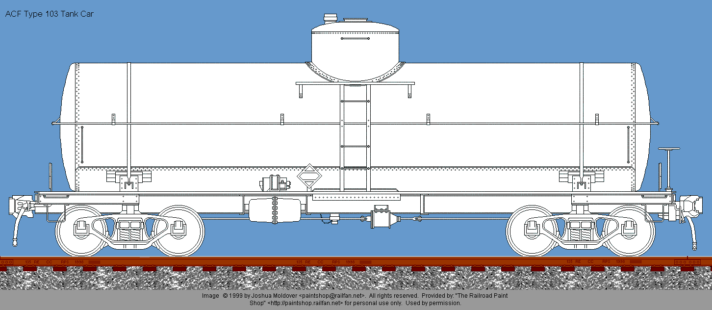 ACF type 103 tank car drawing © 1999 by Joshua Moldover. All rights reserved. Used by permission. If you would like to use this image, or a painted version of it on your web site, you may do so, providing that you notify the artist and place a link back to The Railroad Paintshop. Linking directly to the image on the Railroad Paint Shop site is prohibited. If you want to use the image in any other form of publication, you must have the prior written permission of the artist.