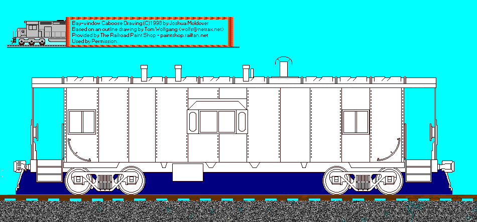 St. Louis Car Co. half-height bay window caboose drawing © 1998 by Joshua Moldover. Based on an outline drawing by Tom Wolfgang. All rights reserved. Used by permission. If you would like to use this image, or a painted version of it on your web site, you may do so, providing that you notify the artist and place a link back to The Railroad Paintshop. Linking directly to the image on the Railroad Paint Shop site is prohibited. If you want to use the image in any other form of publication, you must have the prior written permission of the artist.