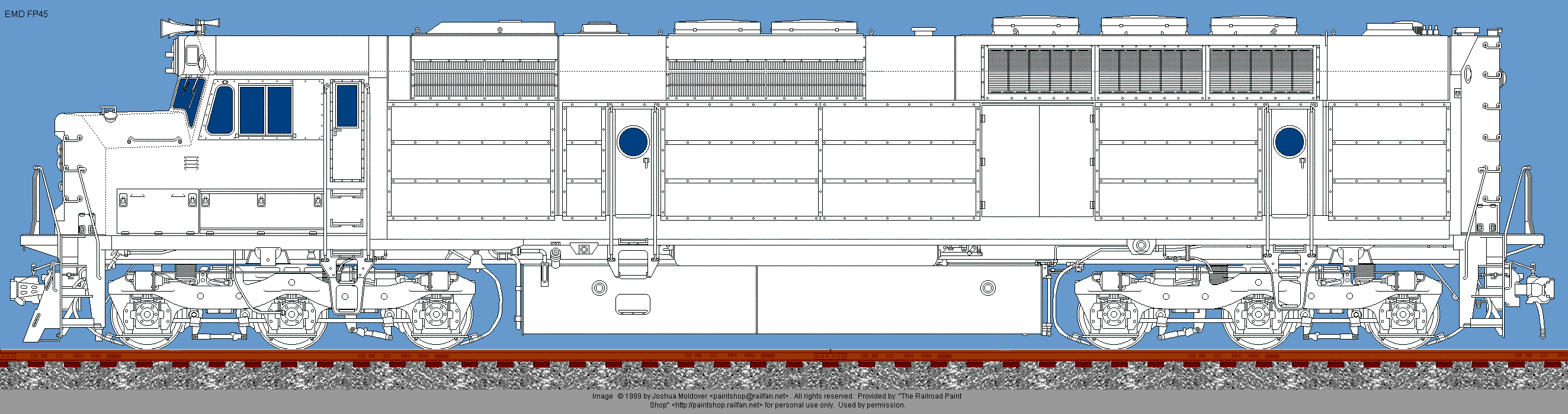 FP45 drawing © 1999 by Joshua Moldover. All rights reserved. Used by permission. If you would like to use this image, or a painted version of it on your web site, you may do so, providing that you notify the artist and place a link back to The Railroad Paintshop. Linking directly to the image on the Railroad Paint Shop site is prohibited. If you want to use the image in any other form of publication, you must have the prior written permission of the artist.