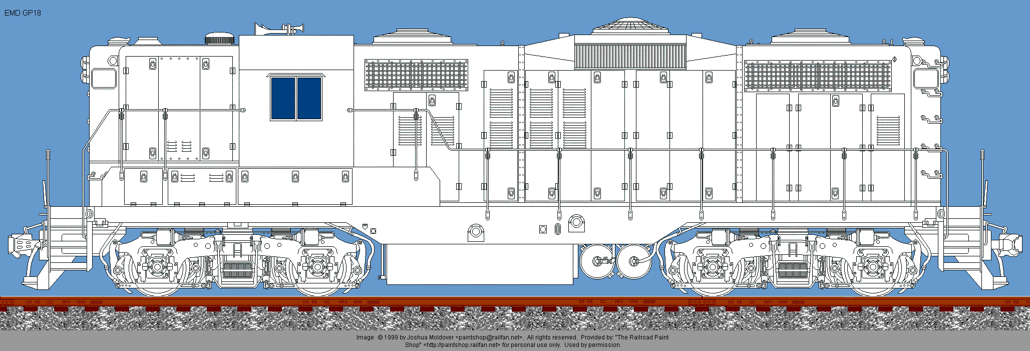 GP18 drawing © 1999 by Joshua Moldover. All rights reserved. Used by permission. If you would like to use this image, or a painted version of it on your web site, you may do so, providing that you notify the artist and place a link back to The Railroad Paintshop. Linking directly to the image on the Railroad Paint Shop site is prohibited. If you want to use the image in any other form of publication, you must have the prior written permission of the artist.
