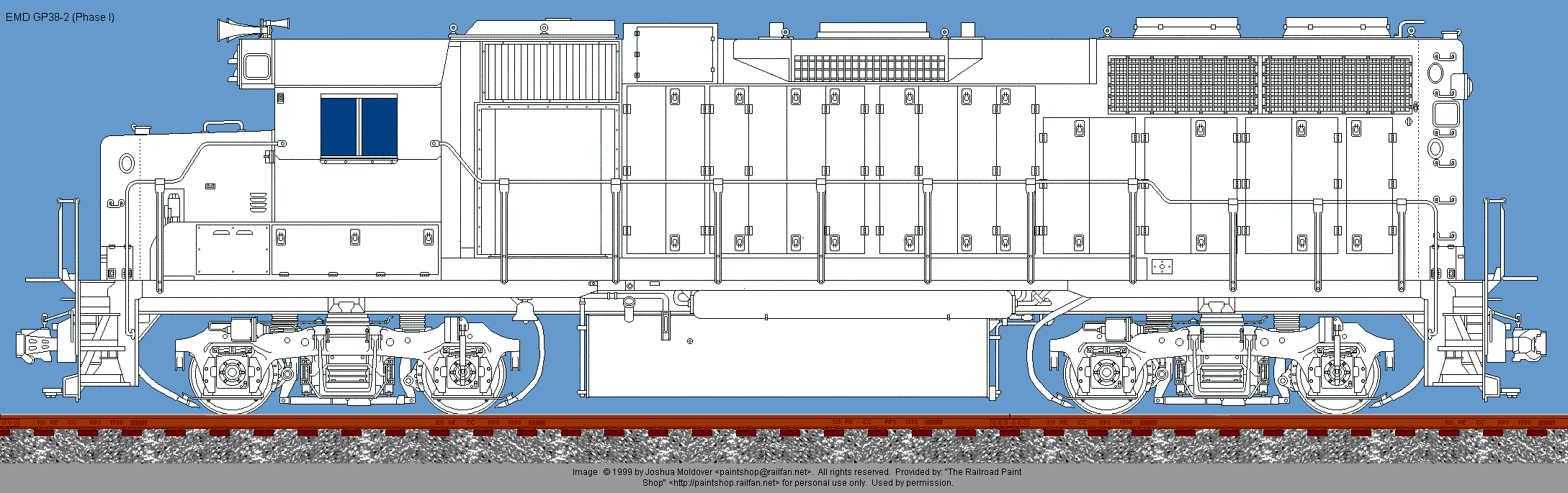 GP38-2 drawing © 1999 by Joshua Moldover. All rights reserved. Used by permission. If you would like to use this image, or a painted version of it on your web site, you may do so, providing that you notify the artist and place a link back to The Railroad Paintshop. Linking directly to the image on the Railroad Paint Shop site is prohibited. If you want to use the image in any other form of publication, you must have the prior written permission of the artist.