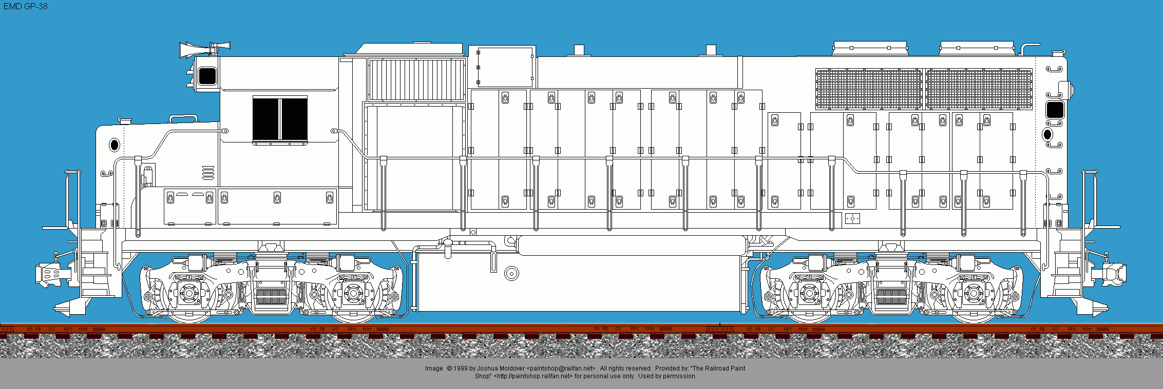 GP38 drawing © 1999 by Joshua Moldover. All rights reserved. Used by permission. If you would like to use this image, or a painted version of it on your web site, you may do so, providing that you notify the artist and place a link back to The Railroad Paintshop. Linking directly to the image on the Railroad Paint Shop site is prohibited. If you want to use the image in any other form of publication, you must have the prior written permission of the artist.