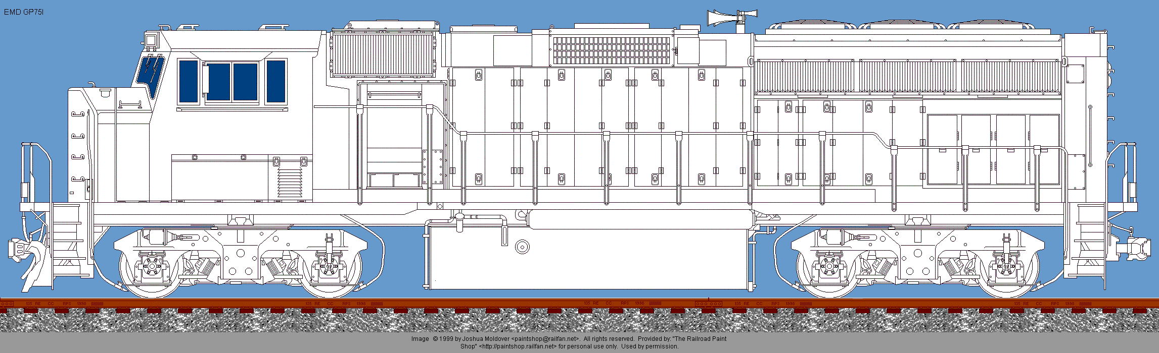 GP75I drawing © 1999 by Joshua Moldover. All rights reserved. Used by permission. If you would like to use this image, or a painted version of it on your web site, you may do so, providing that you notify the artist and place a link back to The Railroad Paintshop. Linking directly to the image on the Railroad Paint Shop site is prohibited. If you want to use the image in any other form of publication, you must have the prior written permission of the artist.