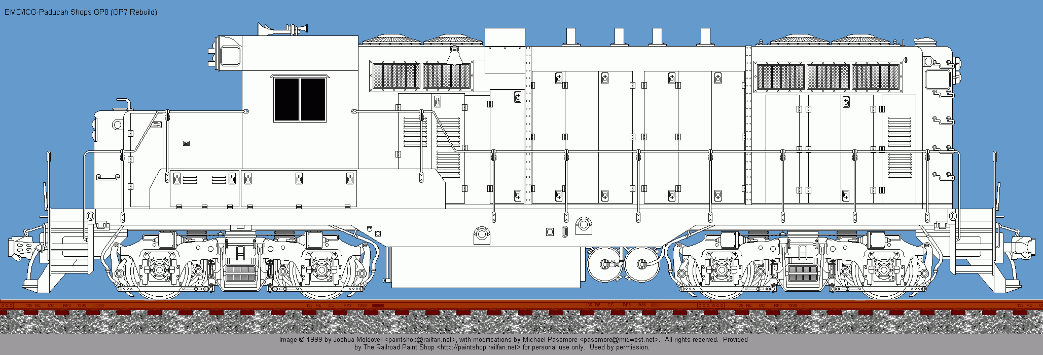 GP8 drawing © 1999 by Joshua Moldover with modifications by Michael Passmore. All rights reserved. Used by permission. If you would like to use this image, or a painted version of it on your web site, you may do so, providing that you notify the artist and place a link back to The Railroad Paintshop. Linking directly to the image on the Railroad Paint Shop site is prohibited. If you want to use the image in any other form of publication, you must have the prior written permission of the artist.