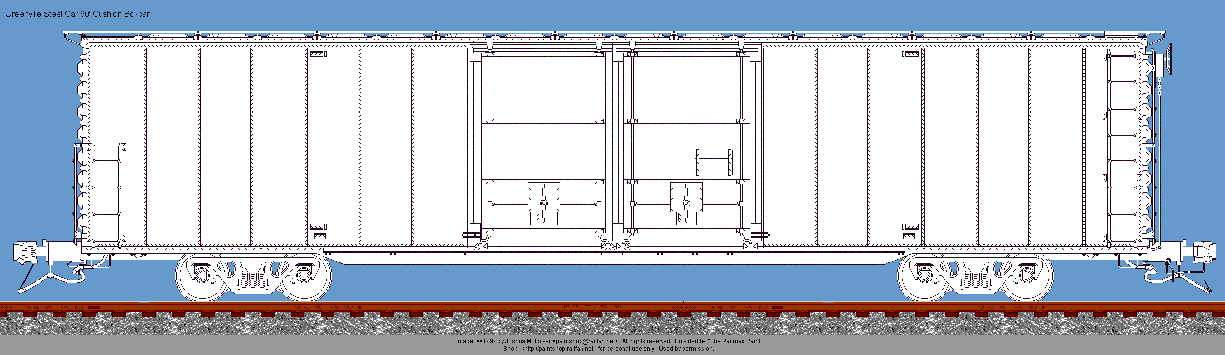 Greenville Steel Car 60-foot boxcar drawing © 1999 by Joshua Moldover. All rights reserved. Used by permission. If you would like to use this image, or a painted version of it on your web site, you may do so, providing that you notify the artist and place a link back to The Railroad Paintshop. Linking directly to the image on the Railroad Paint Shop site is prohibited. If you want to use the image in any other form of publication, you must have the prior written permission of the artist.