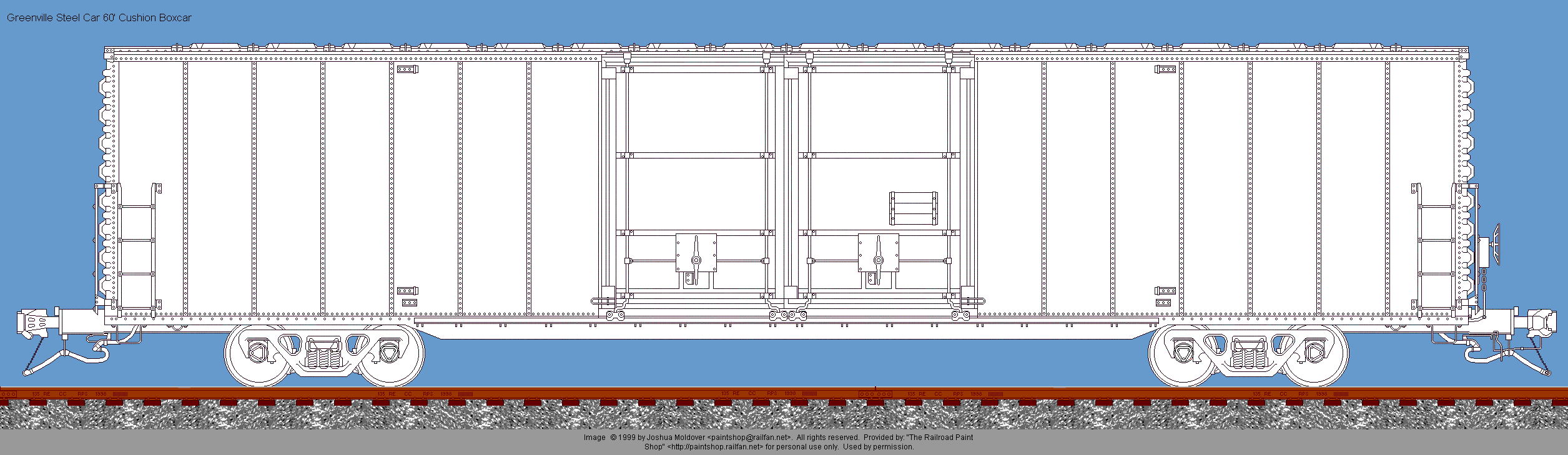 Greenville Steel Car 60-foot boxcar drawing © 1999 by Joshua Moldover. All rights reserved. Used by permission. If you would like to use this image, or a painted version of it on your web site, you may do so, providing that you notify the artist and place a link back to The Railroad Paintshop. Linking directly to the image on the Railroad Paint Shop site is prohibited. If you want to use the image in any other form of publication, you must have the prior written permission of the artist.