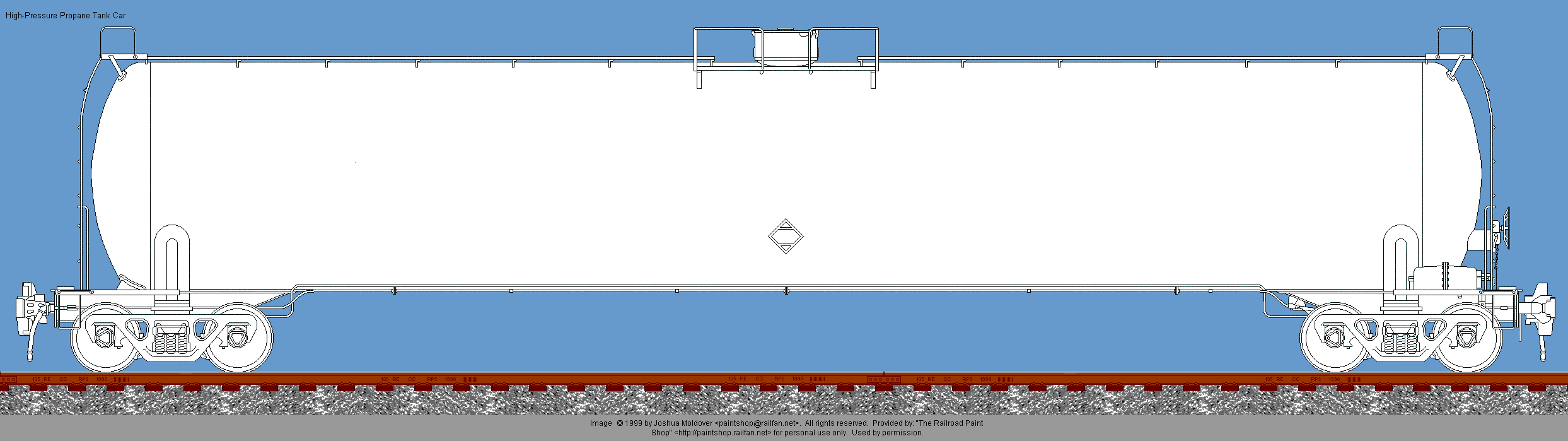 High-pressure propane tank car drawing © 1999 by Joshua Moldover. All rights reserved. Used by permission. If you would like to use this image, or a painted version of it on your web site, you may do so, providing that you notify the artist and place a link back to The Railroad Paintshop. Linking directly to the image on the Railroad Paint Shop site is prohibited. If you want to use the image in any other form of publication, you must have the prior written permission of the artist.