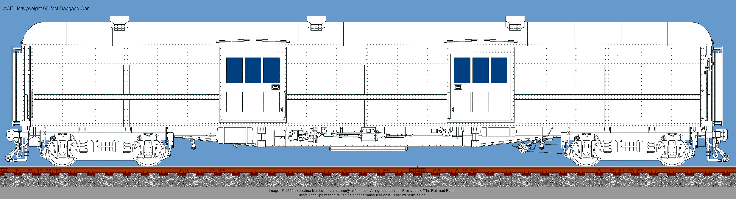 ACF heavyweight 60-foot baggage car drawing © 1999 by Joshua Moldover. All rights reserved. Used by permission. If you would like to use this image, or a painted version of it on your web site, you may do so, providing that you notify the artist and place a link back to The Railroad Paintshop. Linking directly to the image on the Railroad Paint Shop site is prohibited. If you want to use the image in any other form of publication, you must have the prior written permission of the artist.