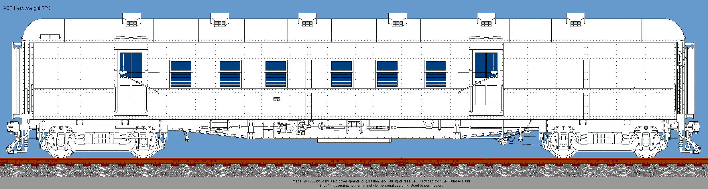 ACF heavyweight 60-foot RPO drawing © 1999 by Joshua Moldover. All rights reserved. Used by permission. If you would like to use this image, or a painted version of it on your web site, you may do so, providing that you notify the artist and place a link back to The Railroad Paintshop. Linking directly to the image on the Railroad Paint Shop site is prohibited. If you want to use the image in any other form of publication, you must have the prior written permission of the artist.