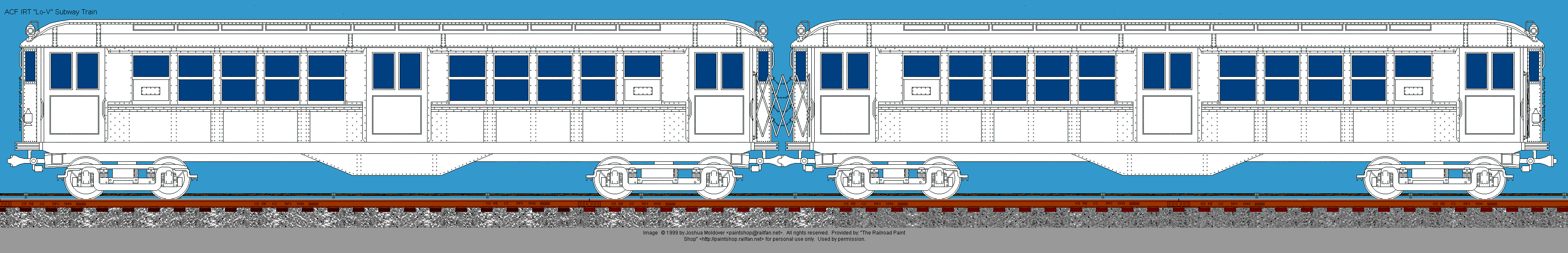 Interborough Rapid Transit "Lo-V" 2-car subway train drawing © 1999 by Joshua Moldover. All rights reserved. Used by permission. If you would like to use this image, or a painted version of it on your web site, you may do so, providing that you notify the artist and place a link back to The Railroad Paintshop. Linking directly to the image on the Railroad Paint Shop site is prohibited. If you want to use the image in any other form of publication, you must have the prior written permission of the artist.