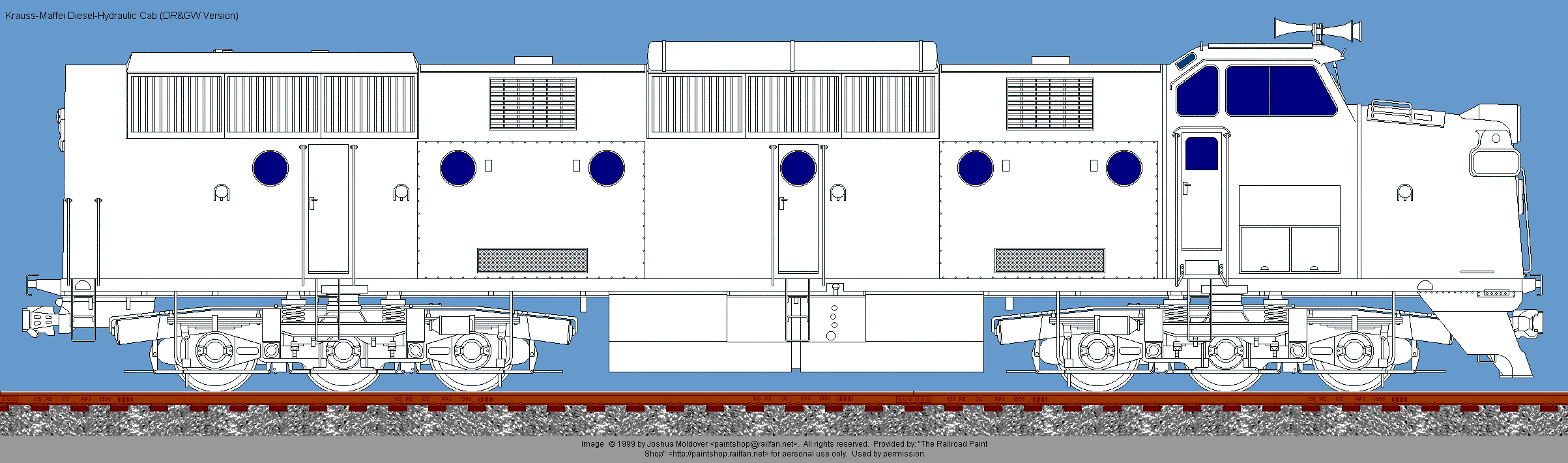 Krauss-Maffei diesel-hydraulic cab unit drawing © 1999 by Joshua Moldover. All rights reserved. Used by permission. If you would like to use this image, or a painted version of it on your web site, you may do so, providing that you notify the artist and place a link back to The Railroad Paintshop. Linking directly to the image on the Railroad Paint Shop site is prohibited. If you want to use the image in any other form of publication, you must have the prior written permission of the artist.