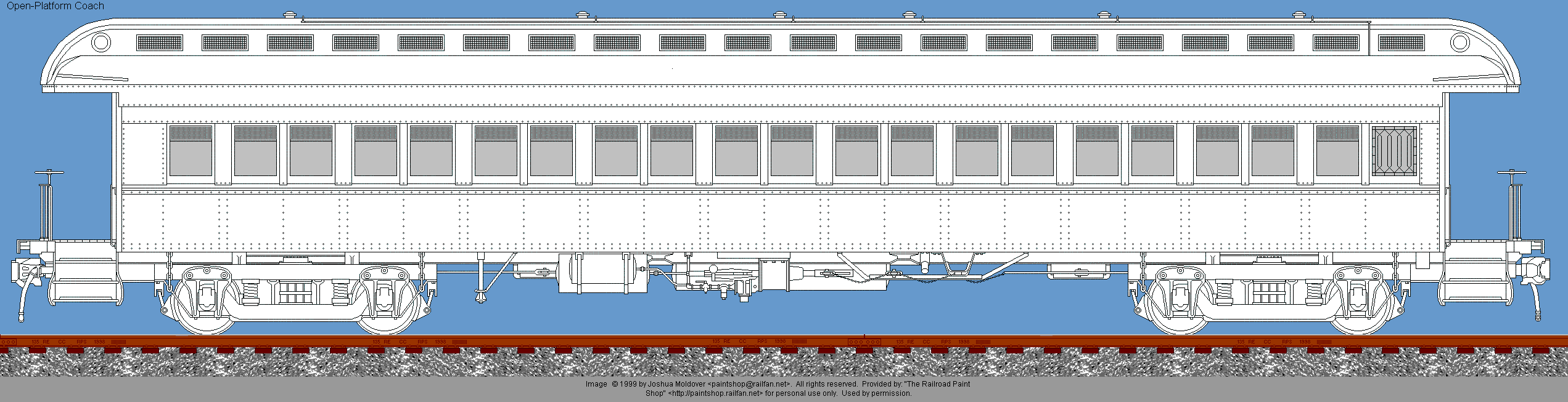 Open-platform steel coach drawing © 1999 by Joshua Moldover. All rights reserved. Used by permission. If you would like to use this image, or a painted version of it on your web site, you may do so, providing that you notify the artist and place a link back to The Railroad Paintshop. Linking directly to the image on the Railroad Paint Shop site is prohibited. If you want to use the image in any other form of publication, you must have the prior written permission of the artist.