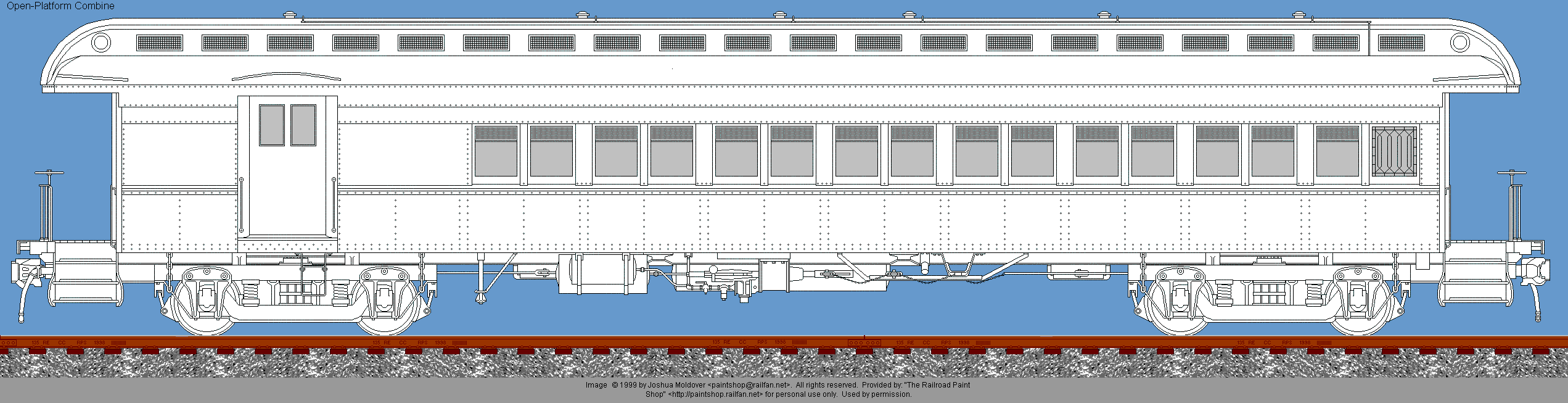 Open-platform steel combine drawing © 1999 by Joshua Moldover. All rights reserved. Used by permission. If you would like to use this image, or a painted version of it on your web site, you may do so, providing that you notify the artist and place a link back to The Railroad Paintshop. Linking directly to the image on the Railroad Paint Shop site is prohibited. If you want to use the image in any other form of publication, you must have the prior written permission of the artist.