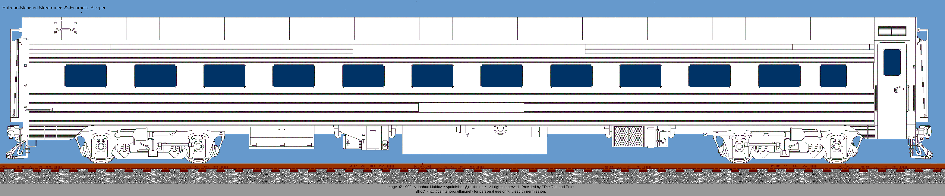 Pullman-Standard streamlined 22 roomette sleeper drawing © 1999 by Joshua Moldover. All rights reserved. Used by permission. If you would like to use this image, or a painted version of it on your web site, you may do so, providing that you notify the artist and place a link back to The Railroad Paintshop. Linking directly to the image on the Railroad Paint Shop site is prohibited. If you want to use the image in any other form of publication, you must have the prior written permission of the artist.