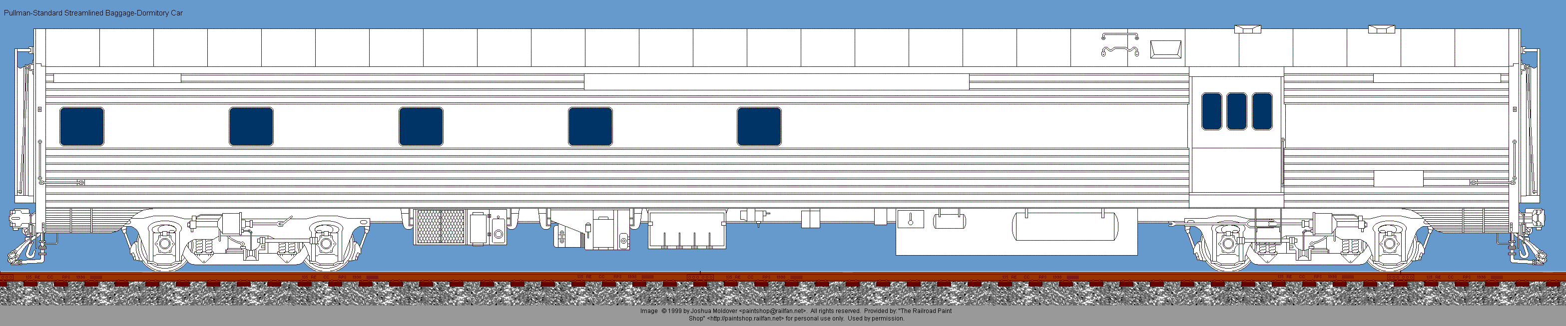 Pullman-Standard streamlined baggage-dormitory drawing © 1999 by Joshua Moldover. All rights reserved. Used by permission. If you would like to use this image, or a painted version of it on your web site, you may do so, providing that you notify the artist and place a link back to The Railroad Paintshop. Linking directly to the image on the Railroad Paint Shop site is prohibited. If you want to use the image in any other form of publication, you must have the prior written permission of the artist.