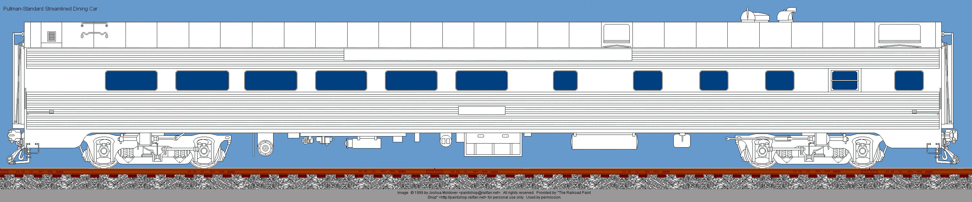 Pullman-Standard streamlined dining car drawing © 1999 by Joshua Moldover. All rights reserved. Used by permission. If you would like to use this image, or a painted version of it on your web site, you may do so, providing that you notify the artist and place a link back to The Railroad Paintshop. Linking directly to the image on the Railroad Paint Shop site is prohibited. If you want to use the image in any other form of publication, you must have the prior written permission of the artist.