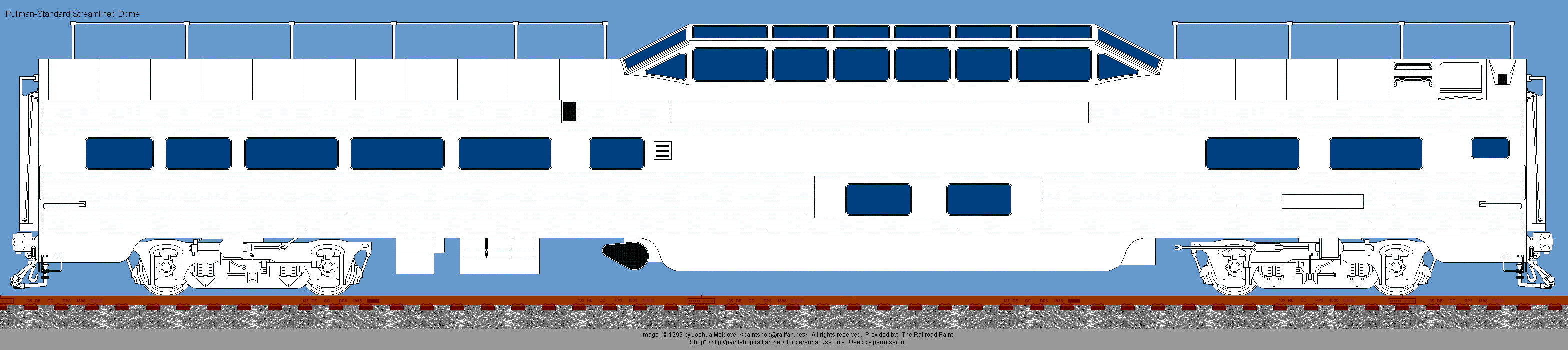 Pullman-Standard streamlined dome car drawing © 1999 by Joshua Moldover. All rights reserved. Used by permission. If you would like to use this image, or a painted version of it on your web site, you may do so, providing that you notify the artist and place a link back to The Railroad Paintshop. Linking directly to the image on the Railroad Paint Shop site is prohibited. If you want to use the image in any other form of publication, you must have the prior written permission of the artist.