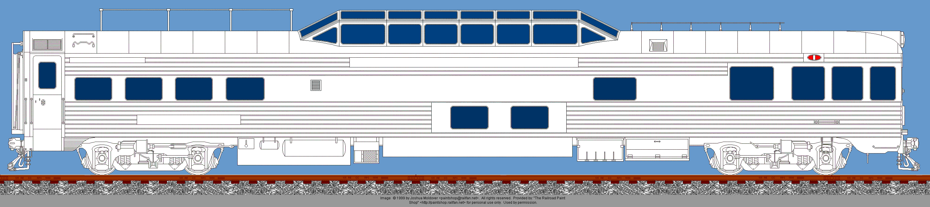 Pullman-Standard streamlined dome observation drawing © 1999 by Joshua Moldover. All rights reserved. Used by permission. If you would like to use this image, or a painted version of it on your web site, you may do so, providing that you notify the artist and place a link back to The Railroad Paintshop. Linking directly to the image on the Railroad Paint Shop site is prohibited. If you want to use the image in any other form of publication, you must have the prior written permission of the artist.