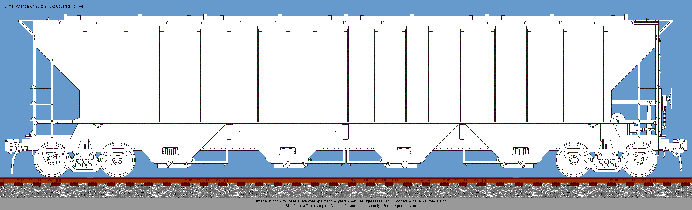 Pullman-Standard 125-ton PS-2 covered hopper drawing © 1999 by Joshua Moldover. All rights reserved. Used by permission. If you would like to use this image, or a painted version of it on your web site, you may do so, providing that you notify the artist and place a link back to The Railroad Paintshop. Linking directly to the image on the Railroad Paint Shop site is prohibited. If you want to use the image in any other form of publication, you must have the prior written permission of the artist.