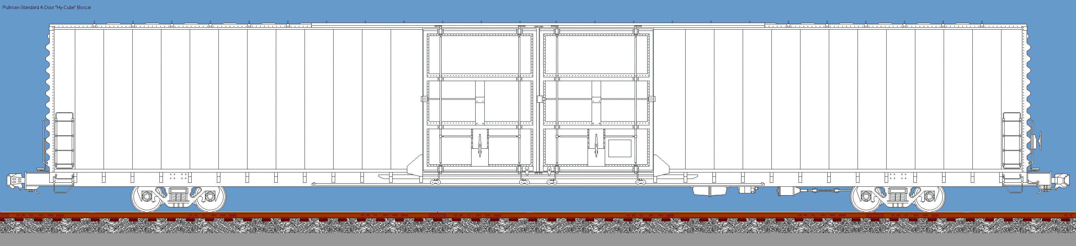 Pullman-Standard 86-foot "Hy-Cube" boxcar drawing © 1999 by Joshua Moldover. All rights reserved. Used by permission. If you would like to use this image, or a painted version of it on your web site, you may do so, providing that you notify the artist and place a link back to The Railroad Paintshop. Linking directly to the image on the Railroad Paint Shop site is prohibited. If you want to use the image in any other form of publication, you must have the prior written permission of the artist.