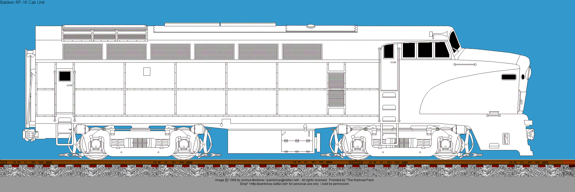 RF-16 cab unit drawing © 1999 by Joshua Moldover. All rights reserved. Used by permission. If you would like to use this image, or a painted version of it on your web site, you may do so, providing that you notify the artist and place a link back to The Railroad Paintshop. Linking directly to the image on the Railroad Paint Shop site is prohibited. If you want to use the image in any other form of publication, you must have the prior written permission of the artist.