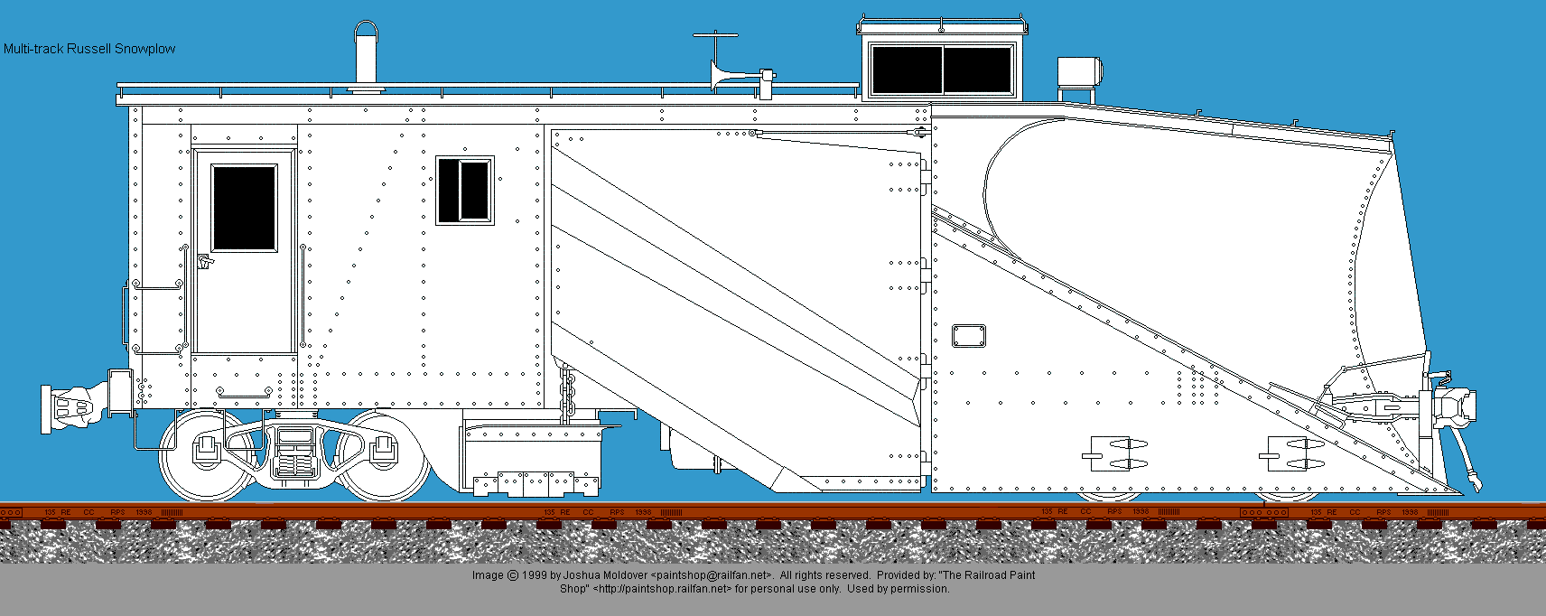 Multi-track Russell snowplow drawing © 1999 by Joshua Moldover. All rights reserved. Used by permission. If you would like to use this image, or a painted version of it on your web site, you may do so, providing that you notify the artist and place a link back to The Railroad Paintshop. Linking directly to the image on the Railroad Paint Shop site is prohibited. If you want to use the image in any other form of publication, you must have the prior written permission of the artist.