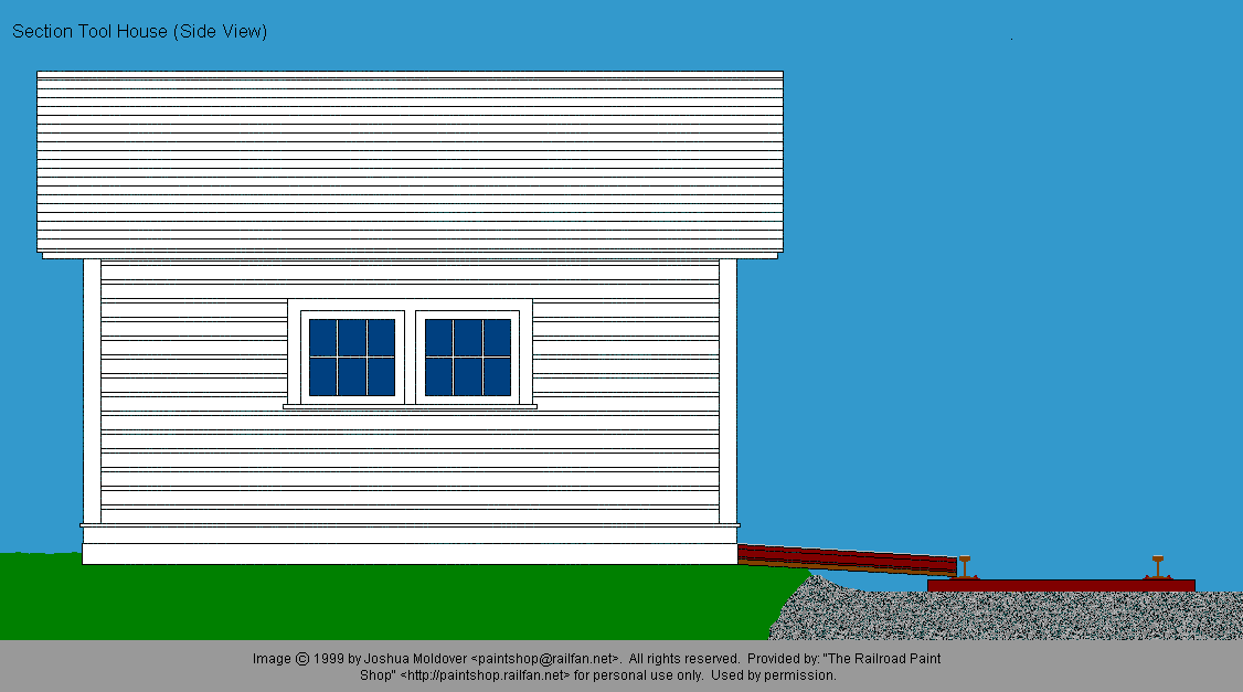 Section car tool house drawing © 1999 by Joshua Moldover. All rights reserved. Used by permission. If you would like to use this image, or a painted version of it on your web site, you may do so, providing that you notify the artist and place a link back to The Railroad Paintshop. Linking directly to the image on the Railroad Paint Shop site is prohibited. If you want to use the image in any other form of publication, you must have the prior written permission of the artist.
