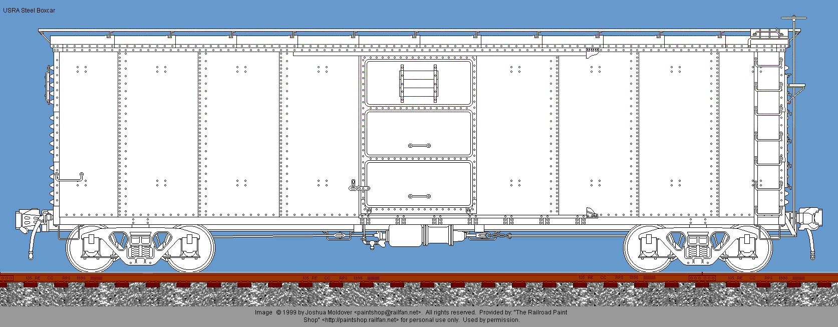USRA-design standard steel boxcar drawing © 1999 by Joshua Moldover. All rights reserved. Used by permission. If you would like to use this image, or a painted version of it on your web site, you may do so, providing that you notify the artist and place a link back to The Railroad Paintshop. Linking directly to the image on the Railroad Paint Shop site is prohibited. If you want to use the image in any other form of publication, you must have the prior written permission of the artist.