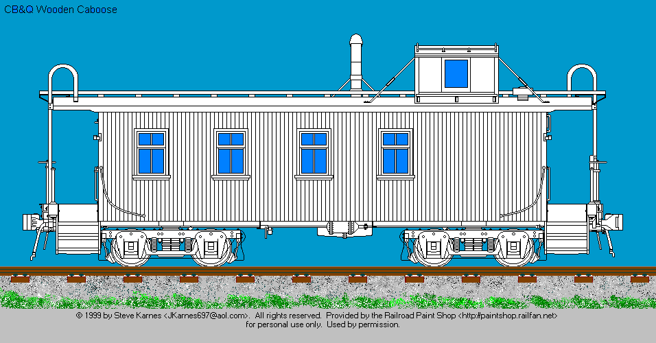 CB&Q Wooden Caboose drawing © 1999 by Steve Karnes. All rights reserved. Used by permission. If you would like to use this image, or a painted version of it on your web site, you may do so, providing that you notify the artist and place a link back to The Railroad Paintshop. Linking directly to the image on the Railroad Paint Shop site is prohibited. If you want to use the image in any other form of publication, you must have the prior written permission of the artist.