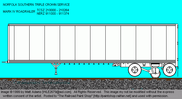 Mark-IV Roadrailer drawing © 1999 by Matt Adams. All rights reserved. Used by permission. If you would like to use this image, or a painted version of it on your web site, you may do so, providing that you notify the artist and place a link back to The Railroad Paintshop. Linking directly to the image on the Railroad Paint Shop site is prohibited. If you want to use the image in any other form of publication, you must have the prior written permission of the artist.