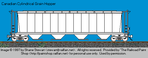 Canadian cylindrical grain hopper drawing © 1997 by Shane Stewart. All rights reserved. Used by permission. If you would like to use this image, or a painted version of it on your web site, you may do so, providing that you notify the artist and place a link back to The Railroad Paintshop. Linking directly to the image on the Railroad Paint Shop site is prohibited. If you want to use the image in any other form of publication, you must have the prior written permission of the artist.