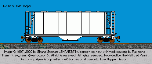 GATX Airslide covered hopper (single bay) drawing © 1997, 2000 by Shane Stewart with modifications by Raymond Hamm. All rights reserved. Used by permission. If you would like to use this image, or a painted version of it on your web site, you may do so, providing that you notify the artist and place a link back to The Railroad Paintshop. Linking directly to the image on the Railroad Paint Shop site is prohibited. If you want to use the image in any other form of publication, you must have the prior written permission of the artist.