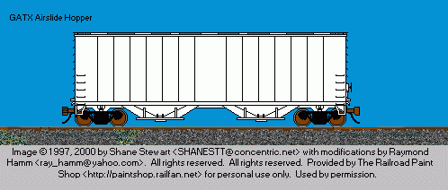 GATX Airslide covered hopper (dual bay) drawing © 1997, 2000 by Shane Stewart with modifications by Raymond Hamm. All rights reserved. Used by permission. If you would like to use this image, or a painted version of it on your web site, you may do so, providing that you notify the artist and place a link back to The Railroad Paintshop. Linking directly to the image on the Railroad Paint Shop site is prohibited. If you want to use the image in any other form of publication, you must have the prior written permission of the artist.
