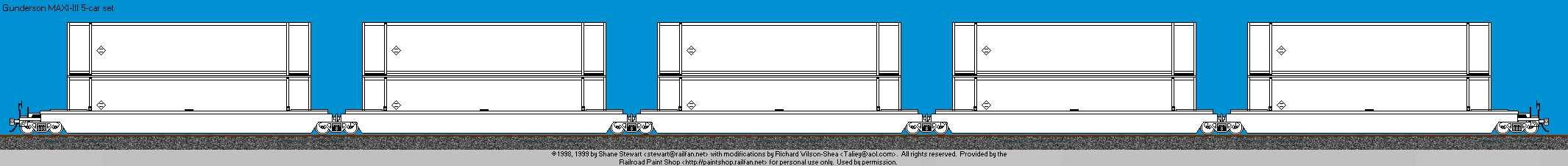 Gunderson MAXI-III 5-car set drawing © 1998, 1999 by Shane Stewart with modifications by Richard Wilson-Shea. All rights reserved. Used by permission. If you would like to use this image, or a painted version of it on your web site, you may do so, providing that you notify the artist and place a link back to The Railroad Paintshop. Linking directly to the image on the Railroad Paint Shop site is prohibited. If you want to use the image in any other form of publication, you must have the prior written permission of the artist.